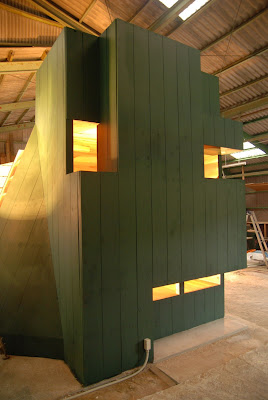 外壁は、黒板塗料で塗装しています。ゆえに、この色と形から、「ザク」という愛称がつきそうです(笑)かっこいいです。7/12に、建築家さんもこられて、完成した建築の内覧会も行われます。建築に興味がある方や、見学希望の方がいらっしゃれば、ご連絡ください。建築家さんたちは、寡黙な方たちですが、めちゃくちゃいい人ですので、質問とかも気軽に応えてくださると思います。